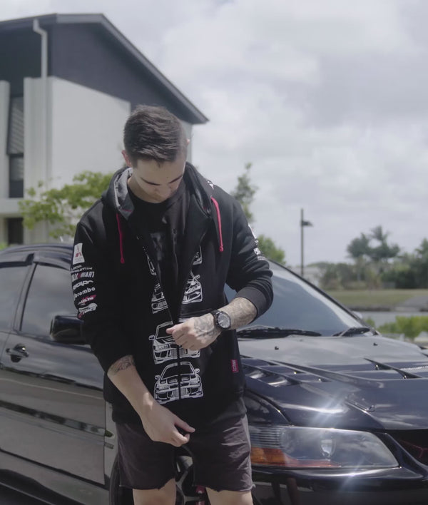 This comfortable hoodie is designed to show off your love of the iconic Japanese sports car. It features bold graphics of the front and rear ends of each Evolution model on the front and back respectively. It also has extra prints on the hood and sleeves for an added layer of style and the full-length zipper lines up perfectly, makes it the perfect choice for any Evo enthusiast.